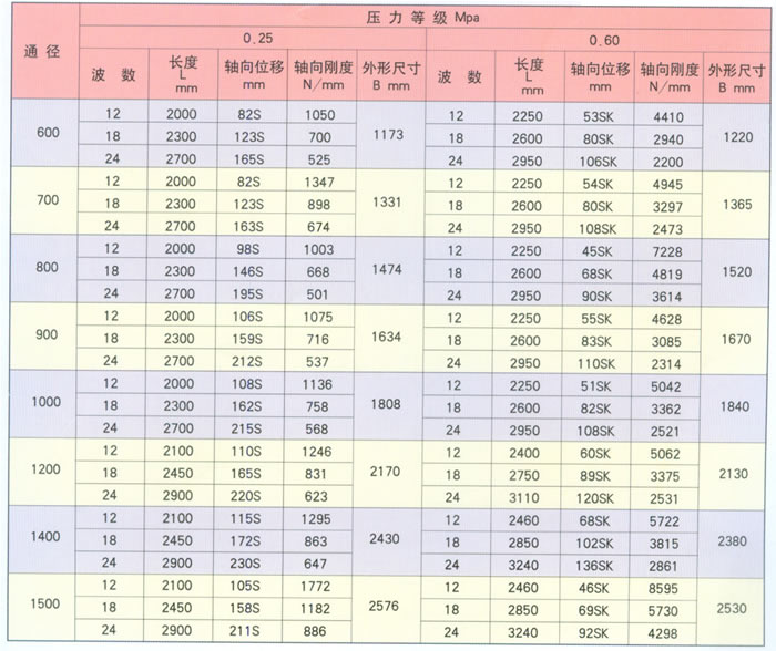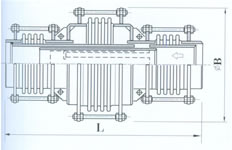 该膨胀节的二端各有一个工作波纹管,中间有一个平衡波纹管,膨胀节通过受力构件(大拉杆或舌管)来承受内压推力,因此管系只需中间固定支架。该膨胀节只能吸收轴。